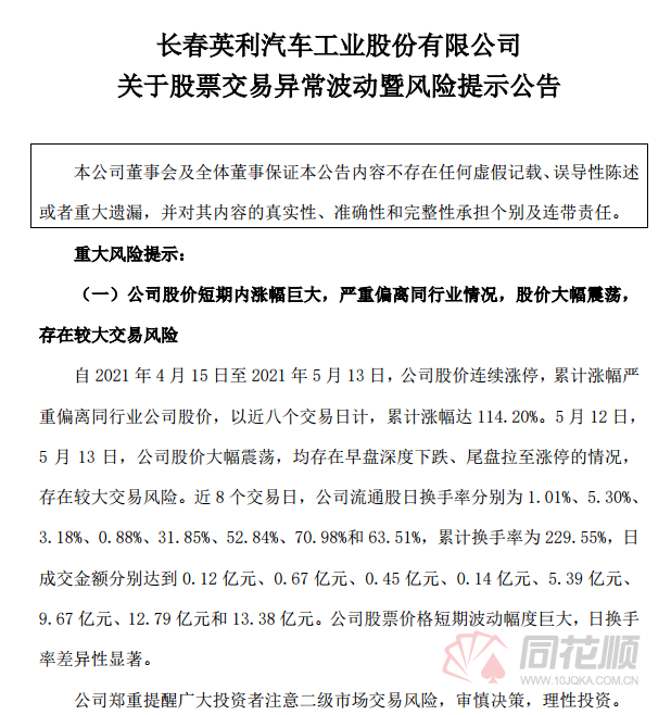 股价连续涨停后,公司于5月7日,11日,12日、13日晚间发布风险提示公告称,公司股价近期涨幅巨大,与同行业公司股票价格变化出现较大偏离,郑重提醒广大投资者注意股票市场投资风险,审慎决策、理性投资。