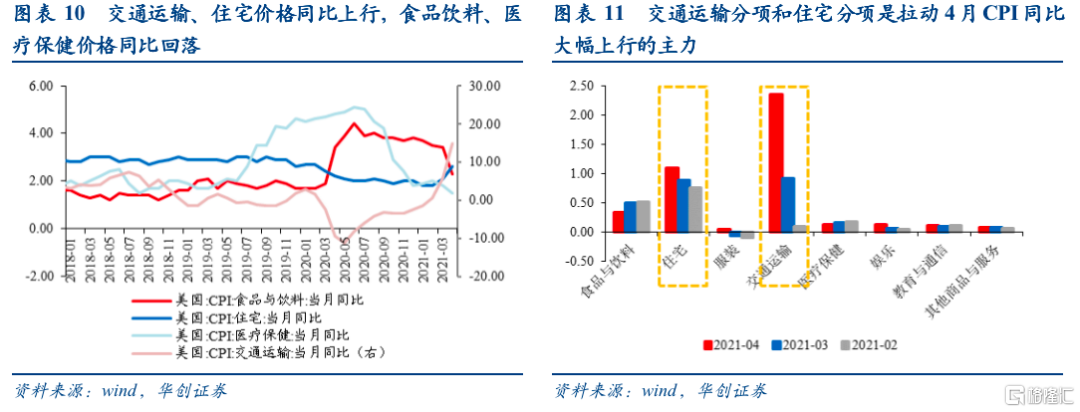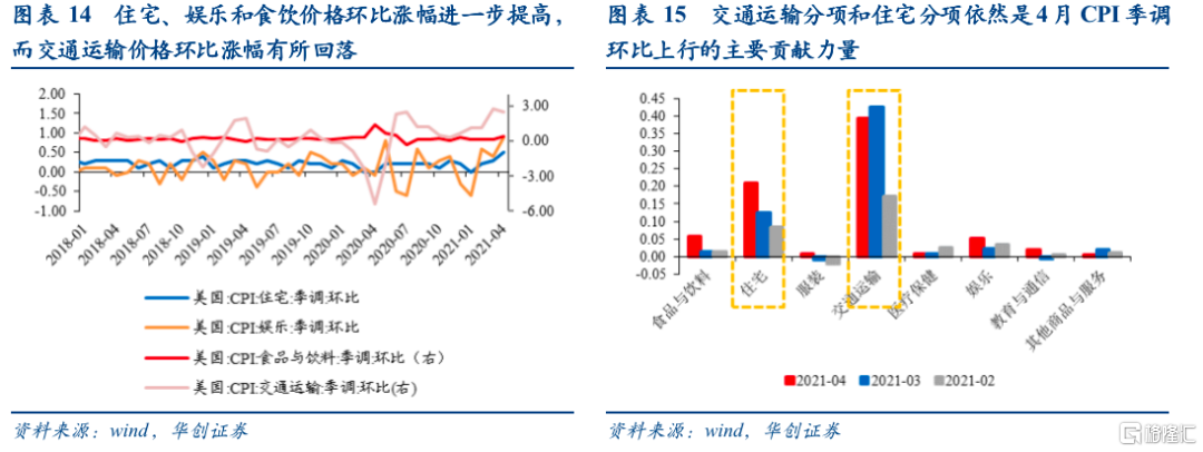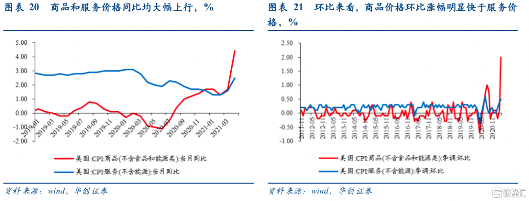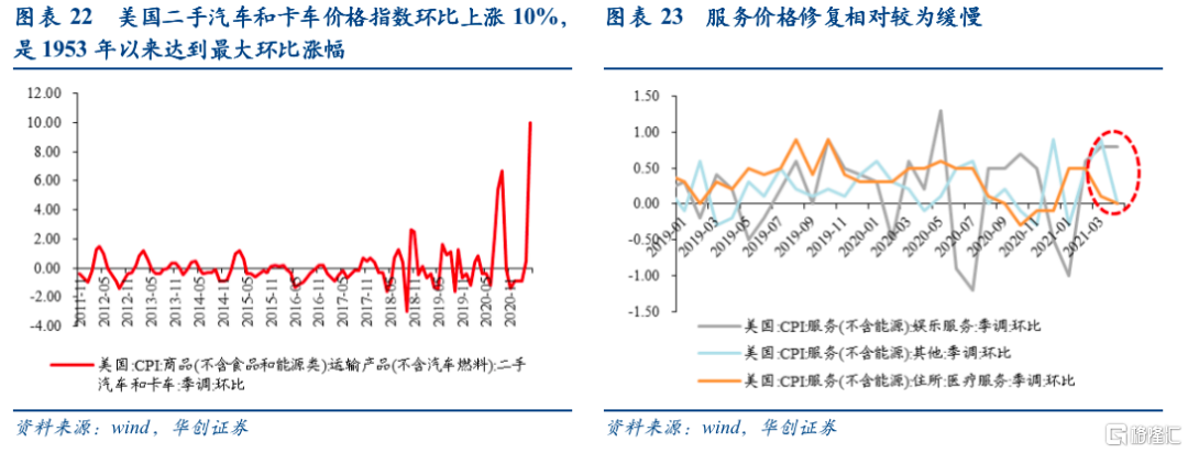 环比来看,商品价格环比涨幅明显快于服务价格。4月商品价格环比上涨2%,前值0.1%;拉动CPI环比0.4个百分点;服务价格环比上涨0.5%,前值0.4%,拉动CPI环比0.3个百分点。商品价格涨幅快于服务价格,表明美国商品消费的修复速度快于服务消费。1.9万亿财政救济后,美国居民变得更加“有钱”,商品消费尤其是汽车等耐用品消费的需求快速增长,一个例证就是,4月份美国二手汽车和卡车价格指数环比上涨10%,是1953年以来达到最大环比涨幅。但另一方面,受限于疫情对某些服务消费场景的限制,服务价格修复相对较为缓慢,比如4月医疗服务价格环比持平3月,涨幅较3月缩小0.9个百分点;其他个人服务价格环比0.1%,涨幅缩小0.1个百分点;娱乐消费环比0.8%,与3月持平。