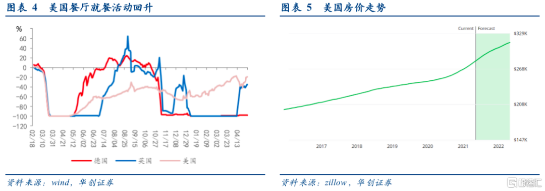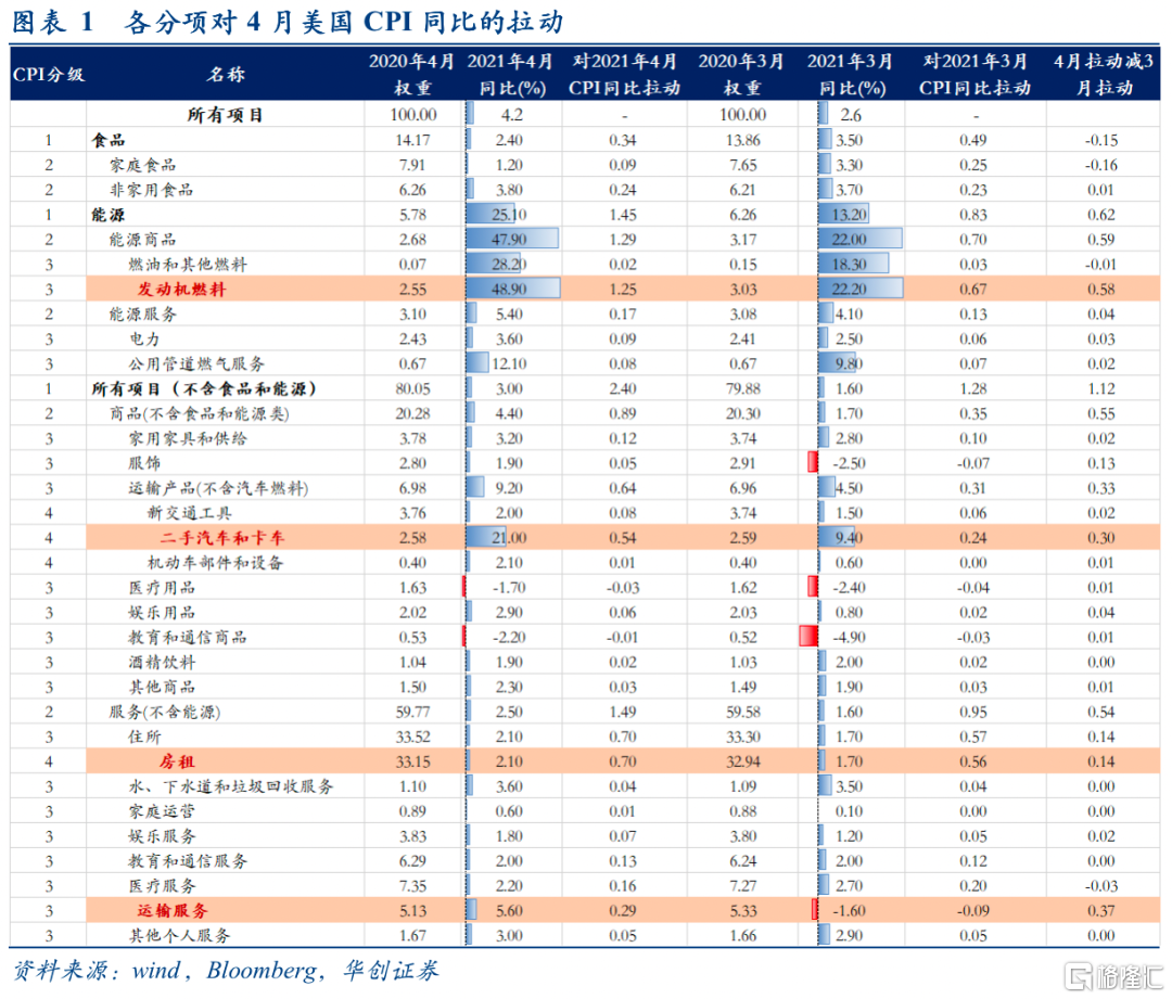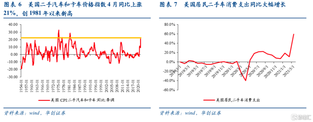 因素三,美国二手汽车和卡车价格同比大增,带动商品价格同比大幅上行,这一点或是市场没有预期到的。美国二手汽车和卡车价格指数4月同比上涨21%,创1981年以来新高,其3月同比为9.4%,4月对CPI同比的拉动较3月高出了0.3个百分点。此外,二手车价格主要来自于需求推动,3月1.9万亿财政救济落地后(尤其是现金支票发放),美国居民“变富”,叠加疫苗接种带来的出行改善,美国机动车消费支出3月份大幅增长,预计4月消费需求也不会低。