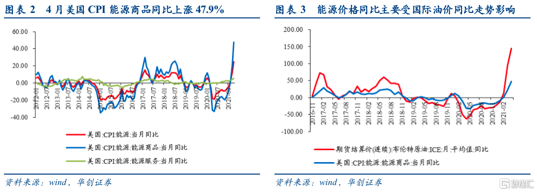 因素一,国际油价带动美国能源品价格同比高增,这一因素是市场能预期到的。CPI能源主要包括能源商品和能源服务,二者的占比大概各半,但能源价格的波动主要来自于能源商品,能源服务价格波动很小。相较3月,4月能源大类对CPI同比拉动的额外贡献几乎全部来自于能源商品(发动机燃料)的上涨。能源商品价格4月同比上涨47.9%,拉动CPI同比上涨1.45个百分点,拉动率较上月增加约0.59个百分点。能源价格同比大幅上涨主要受低基数下国际油价同比走势影响,3月布伦特原油价格同比上涨94.8%,2月同比则为12.3%。