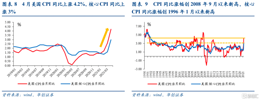4月美国CPI同比4.2%,预期3.6%,前值2.6%,CPI同比涨幅创2008年9月以来新高;核心CPI同比3%,预期2.3%,前值1.6%,核心CPI同比涨幅创1996年1月以来新高。