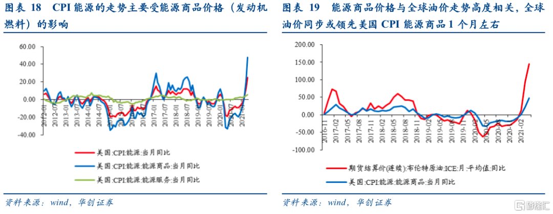 CPI能源价格同比上涨25.1%,前值13.2%,拉动CPI同比上涨1.45个百分点;环比下降0.1%,前值5%,拖累CPI环比0.01个百分点。CPI能源的走势主要受能源商品价格(发动机燃料)的影响,而能源商品价格与全球油价走势高度相关。
