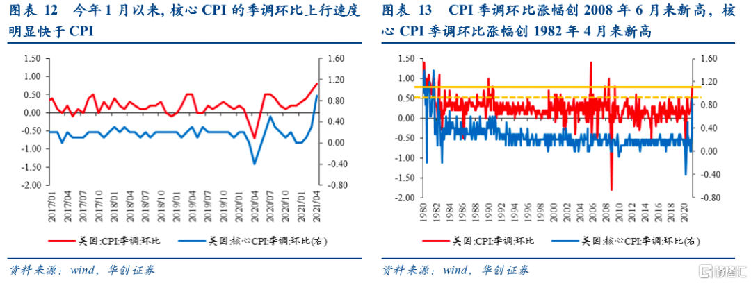环比来看,4月美国CPI季调环比上涨0.8%,预期0.2%,前值0.6%,CPI季调环比涨幅创2008年6月来新高;核心CPI季调环比上涨0.9%,预期0.3%,前值0.3%,核心CPI季调环比涨幅创1982年4月来新高。今年1月以来,核心CPI的季调环比上行速度明显快于CPI。(美国劳工部一般用季调数据来看环比节奏,下文中的环比均为季调环比)