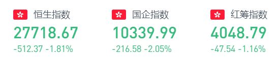 周四收盘,恒生指数跌512.37点或1.81%,报27718.67点。国企指数跌2.05%,报10339.99点,红筹指数跌1.16%,报4048.79点。