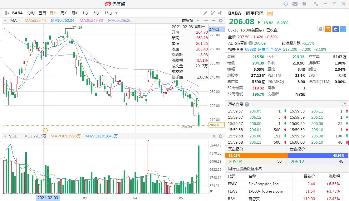 消息出来后,美股大涨,阿里巴巴却直接大跌。截至周四收盘,阿里跌6.28%。