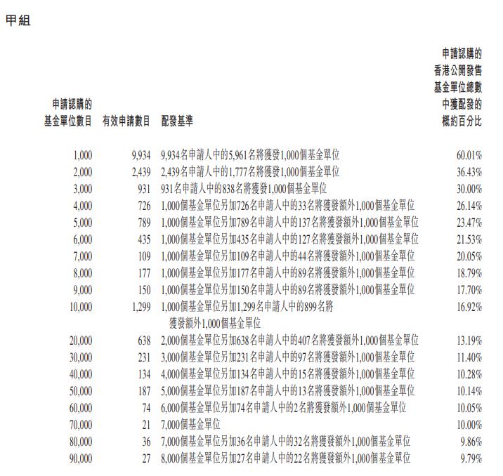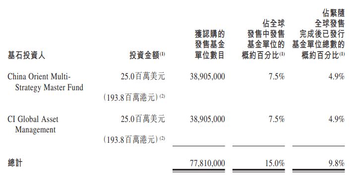 按发售价每个发售基金单位4.98港元计算,基石投资人认购的发售基金单位数目厘定如下:
