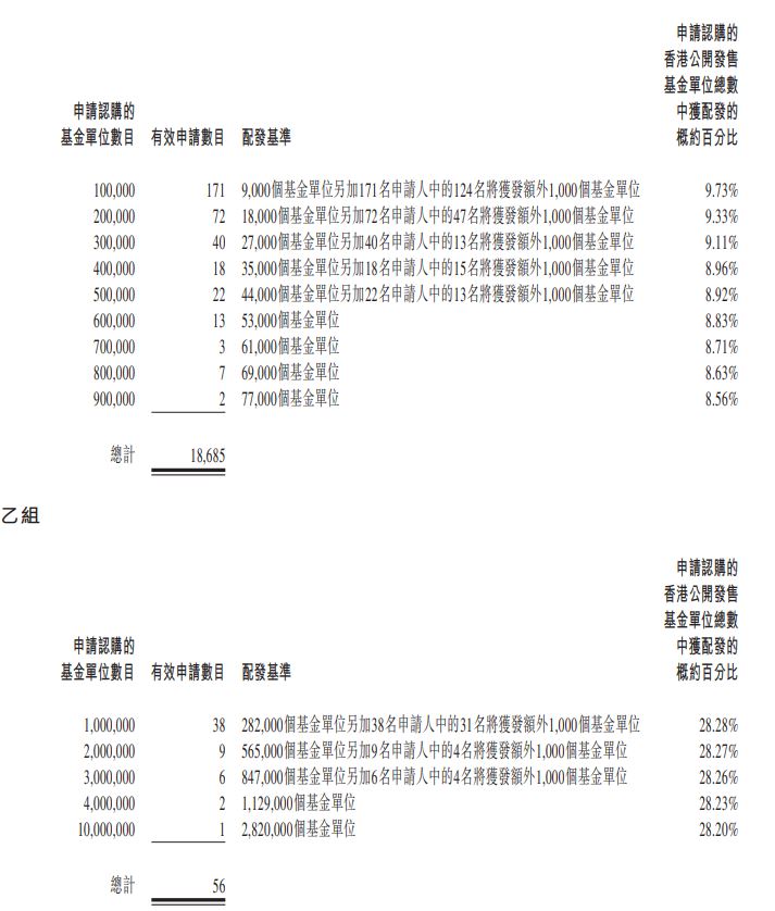 香港公开发售项下初步可供认购的香港公开发售基金单位已获相当程度超额认购。合共接获18,741份根据香港公开发售透过网上白表服务及中央结算系统EIPO服务提出的有效申请,认购合共260,203,000个香港公开发售基金单位,相当于香港公开发售项下初步可供认购香港公开发售基金单位总数52,000,000个的约5倍。