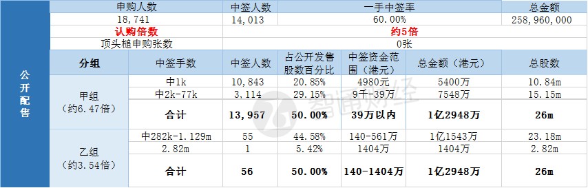 其中,公开配售申购人数18741人,一手中签率60%,认购倍数约5倍。