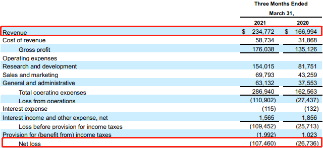 公司于5月11日公布了2021年Q1财报,数据显示在今年第一季度,公司营收升至2.35亿美元,同比大幅增加41%,也高于分析师普遍预期的2.1亿美元。不过净亏损方面也有所扩大,相比于因疫情而明显受益的2020年第一季度,2021年第一季度亏损超过1亿美元,同比剧增400%。不过公司认为,不利影响主要是来自IPO后的一些未偿费用和增加员工所带来的开支。