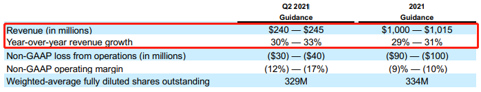 尽管还未能盈利,但强劲的营收和业务增长趋势,还是让公司信心十足。在财报发布后,公司上调了2021年Q2和全年营收指引:将Q2营收预期上调至2.4-2.45亿美元,同比增长30%-33%;将2021年全年营收上调至10-10.15亿美元,同比增长29%-31%。