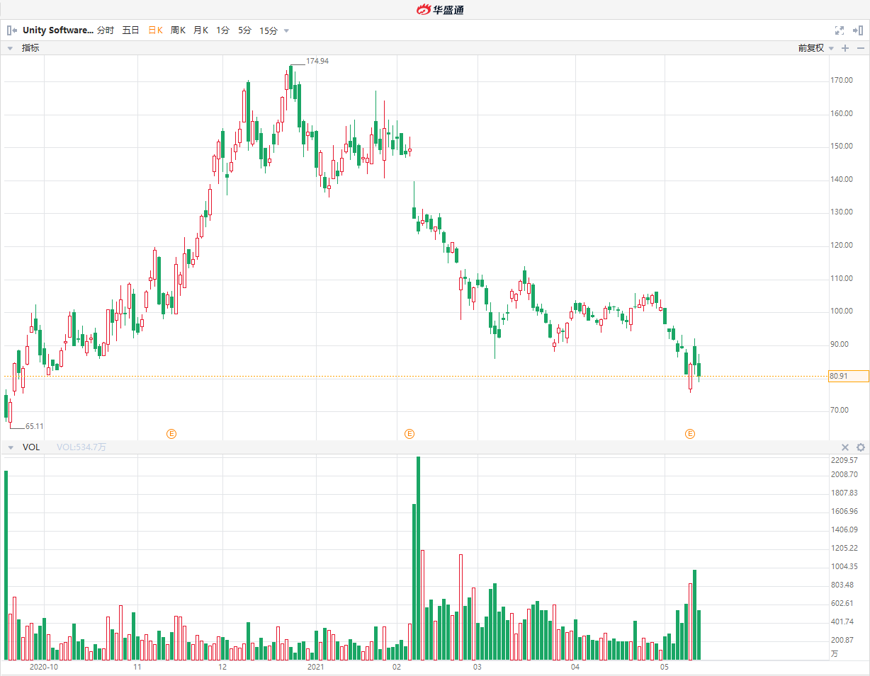 早在今年3月,高盛就发布了对Unity的买入评级,目标价为126美元。在Q1财报公布后,高盛再次声明买入机会。也就是说,根据5月13日最新收盘价80.91美元来计算,仍有超过50%的上涨空间。事实上,Unity上市之后便获得市场青睐,股价一度被推高至175美元。不过由于疫情红利消退和对估值的重新思考,到目前股价已从高位腰斩。