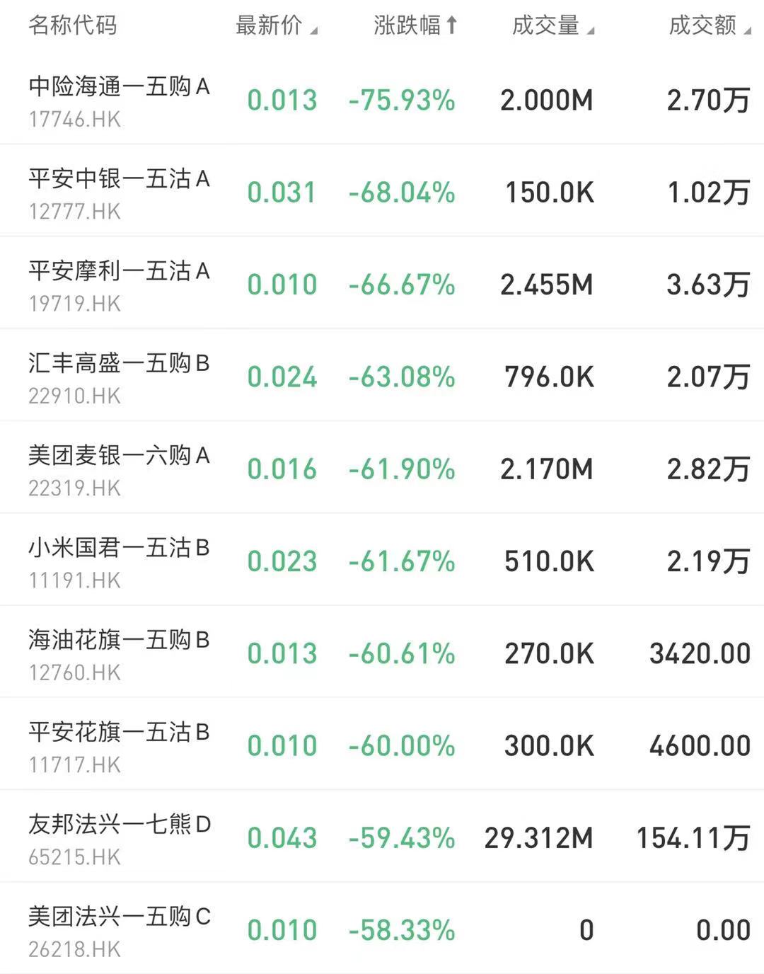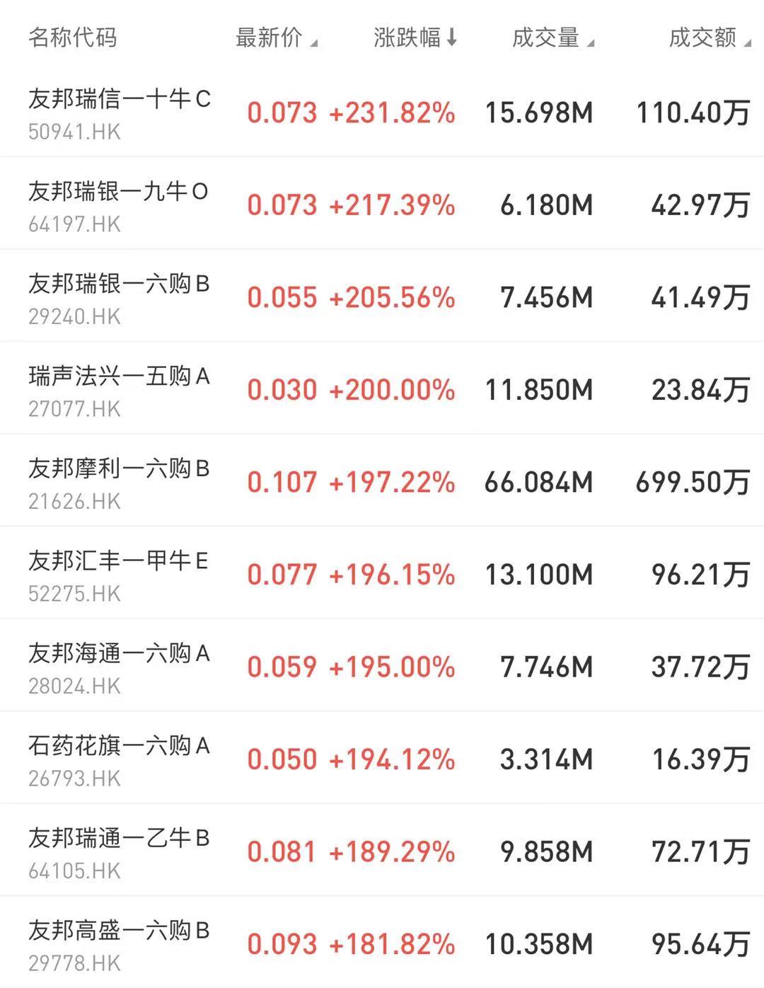 值得注意的是,友邦牛证、购证合计超40只涨幅在100%以上(包含100%)