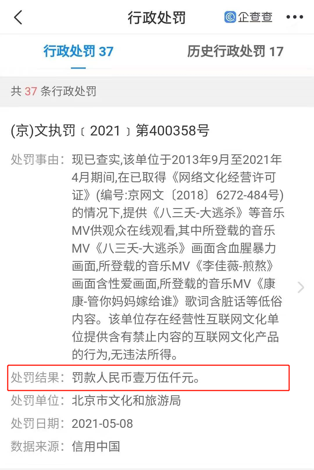 企查查APP显示,5月8日,北京爱奇艺科技有限公司新增一条行政处罚信息,处罚事由为爱奇艺提供含有禁止内容的互联网文化产品的行为,处罚单位为北京市文化和旅游局,罚款人民币1.5万元。
