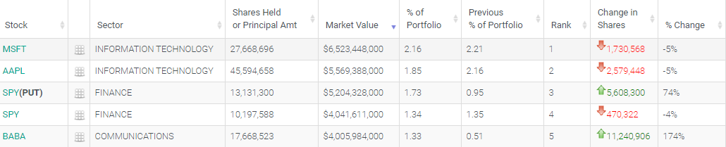 瑞银的前五大持仓股包括:微软、苹果、标普500指数ETF看跌期权、标普500指数ETF和阿里巴巴。