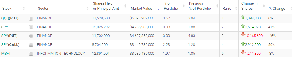 同时,还减持了3001只个股,清仓了1785只个股。前五大卖出标的分别是:特斯拉看跌期权、标普500指数看跌期权、特斯拉看涨期权、黄金ETF看涨期权和欧澳远东指数ETF-iShares MSCI看跌期权。