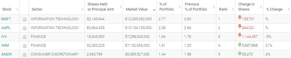 前五大重仓股分别为微软、苹果、iShares标普500ETF、iShares罗素2000 ETF及亚马逊。