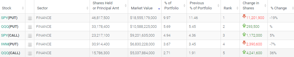 花旗在第一季度的持仓组合中新增了600只个股,增持了2184只个股。前五大买入标的分别是:标普500指数、标普500指数看涨期权、纳指100EFT看涨期权、纳指100ETF看跌期权、债券指数ETF-iShares iBoxx高收益公司债看跌期权。