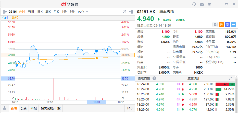 华盛资讯5月14日讯,顺丰旗下房地产投资信托基金-顺丰房托(02191.HK)暗盘收报4.940港元,较发行价4.980港元微跌0.80%,一手账面亏损40港元。