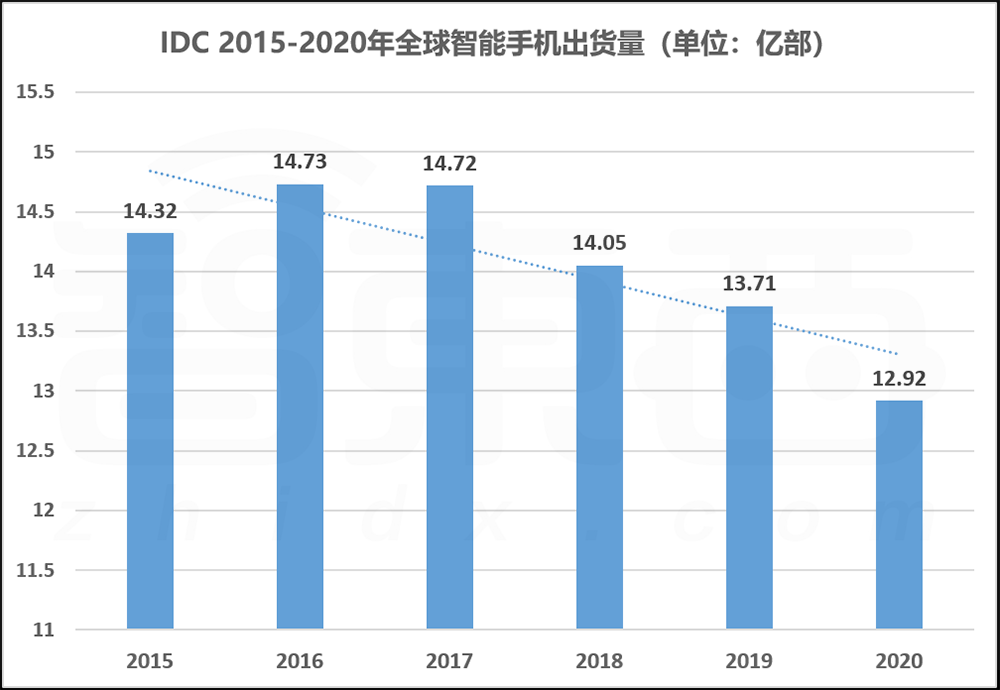 根据IDC数据来看,如果抛开今年一季度,全球智能手机市场出货量已经连续4年呈现下滑趋势,在2016、2017年左右的巅峰时期,全球智能手机出货量曾达到14.7亿部,随后连续下降至2020年的12.9亿部。