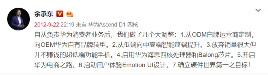 值得一提的是,十年前余承东接手华为消费者业务时,也做出了自己的规划:从ODM白牌定制机向高端自有品牌转型、启用华为海思芯片、启动Emotion UI设计、开启电商渠道、确立硬件世界第一的目标。