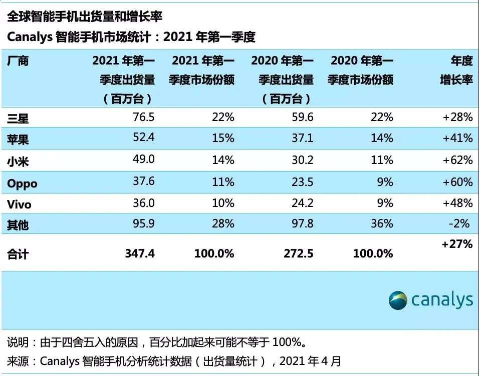 2020年初疫情对中国手机市场销量影响较大,如果与2019年做对比,则今年一季度国内手机出货量同比大约在27%左右。毫无疑问,后续小米OV的手机销量同比增速会有一定程度的缓慢下降。