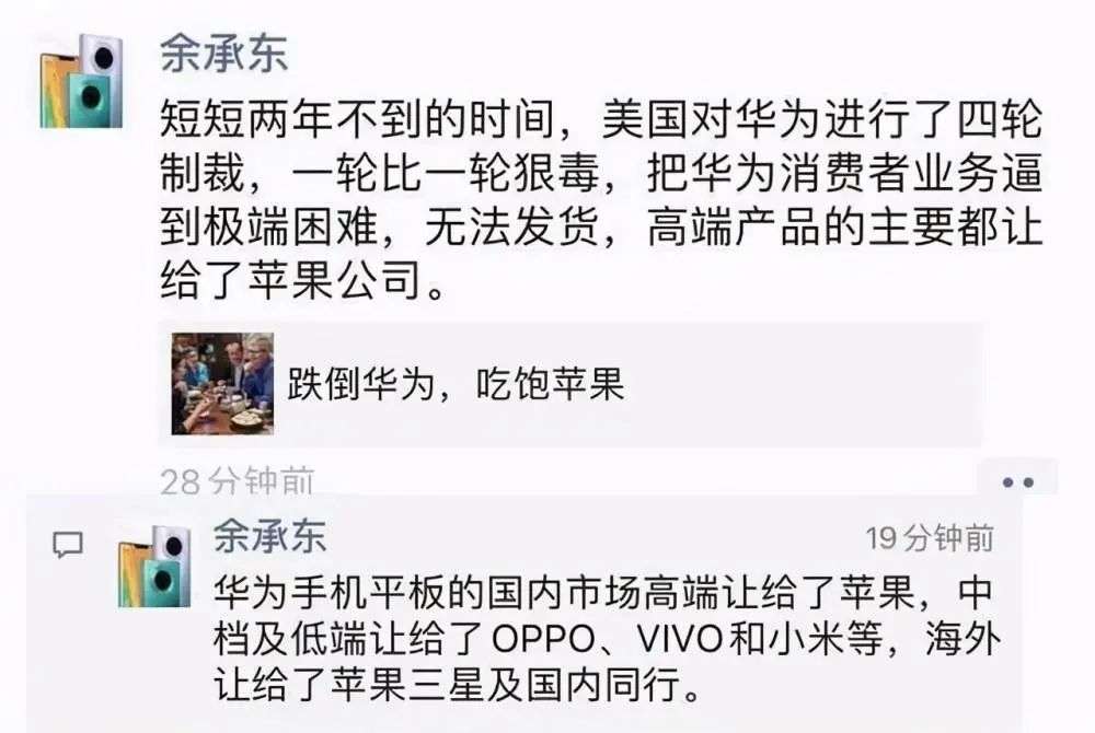 华为和荣耀的目标一直都是三星苹果,很少直接提及小米OV等厂商的名字,通常在公开场合只会以“友商”称呼。当然,朋友圈是属于相对非公开的领域,但近期这些言论还是难免让人感到一丝辛酸。