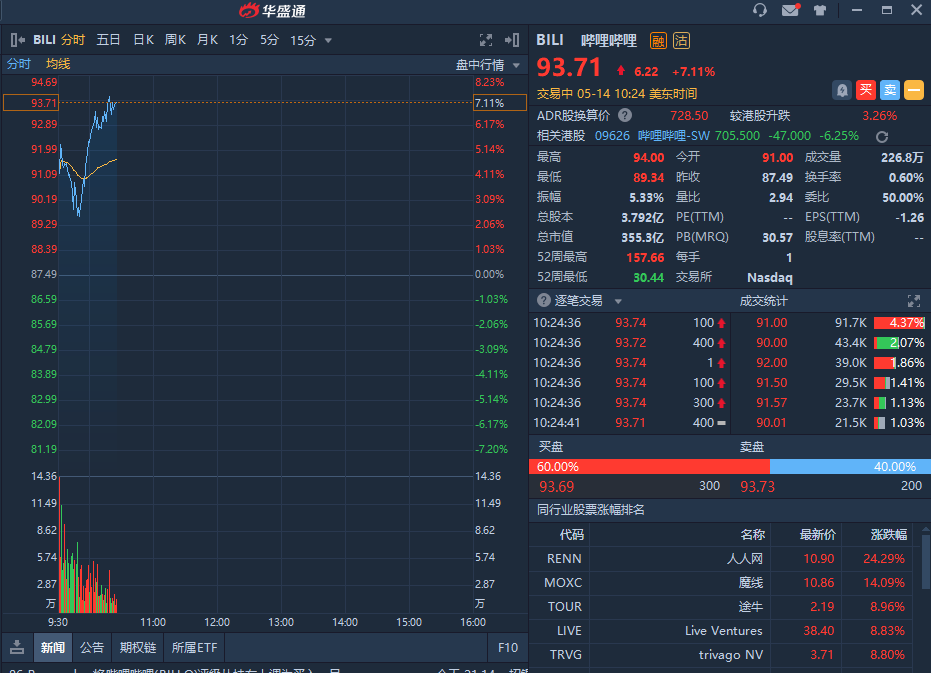 华盛资讯5月14日讯,美股早盘,中概股板块经历昨天普跌之后,今日大幅拉升。截止发稿,哔哩哔哩(BILI)涨超7%,华米科技(ZEPP)涨近7%,搜狐(SOHU)涨近6%,图森未来(TSP)涨近3%,搜狗(SOGU)涨超1%。