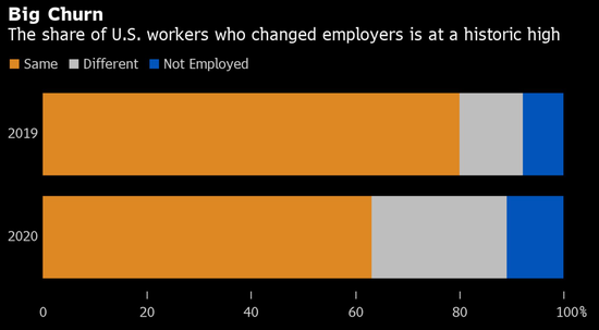 根据一项研究,自疫情开始以来,超过三分之一的美国工人更换了雇主或失去了工作,是过去20年典型水平的两倍。
