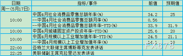 周一(5月17日)关键词:中国消费、中国固投、中国工业、博斯蒂克、克拉里达