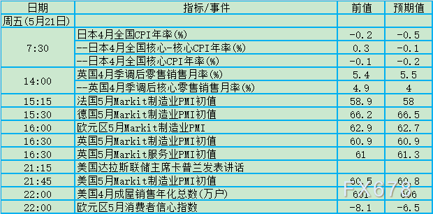 周五(5月21日)关键词:日本CPI、英国零售、欧元区PMI、卡普兰