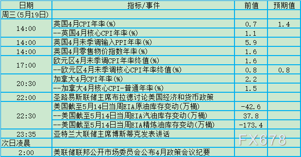 周三(5月19日)关键词:英国CPI、加拿大CPI、EIA、美联储纪要、布拉德