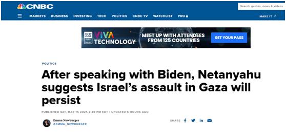 【环球网报道 见习记者林泽宇】美国总统拜登15日分别与以色列和巴勒斯坦领导人通电话,讨论巴以双方仍在持续的冲突。据美国消费者新闻与商业频道(CNBC)报道,在和拜登通话后,以色列总统内塔尼亚胡当晚暗示,以色列(对加沙地带)的行动将继续,直到其实现目标。