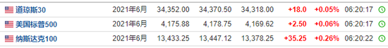 截至发稿,道指期货涨18点或0.05%,报34352.00点;标普500指数期货涨2.50点或0.06%,报4175.88点;纳斯达克100指数期货涨35.25点或0.26%,报13433.25点。