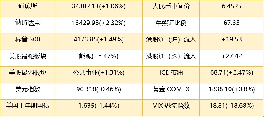 1、上周五美股截至收盘,道琼斯指数涨359.30点,涨幅1.06%,报34,382.13点;标普500指数涨60.72点,涨幅1.49%,报4,173.85点;纳斯达克综合指数涨304.99点,涨幅2.32%,报13429.98点。上周道指累计下跌1.1%,标普500指数下跌1.4%,纳指下跌2.3%。港股ADR指数也上涨,按比例计算,收报28253点,涨225.74或0.80%。