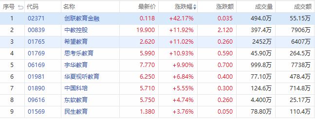 华盛资讯5月17日消息,教育股拉升走高。截止发稿,创联教育金融上涨超40%;中教控股、希望教育涨超11%;思考乐教育涨超10%;宇华教育上涨逾9%;华夏视听教育上涨超6%;中国科培涨超5%;东软教育涨超4%;民生教育涨超3%。