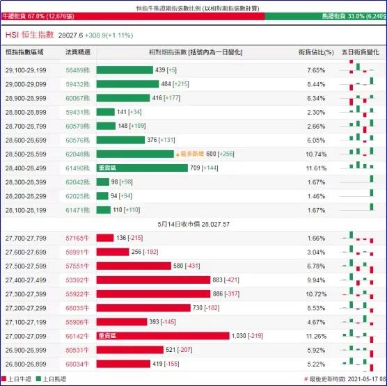 街货分布方面,至上周五,恒指牛证街货主要在收回价27200点至27800点之间,累计相当约3471张期指合约;贴价恒指熊证街货相对稀疏,在收回价28100点至28700点之间,累计相当约1987张期指合约。