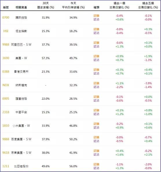 上周五恒指相关权证的平均引伸波幅报约18.2%,按日小幅下降。个股方面,近一周阿里巴巴、港交所、中国平安、小米集团相关权证的引伸波幅均有所上涨;美团、京东集团相关权证的引伸波幅上周五也有上升。