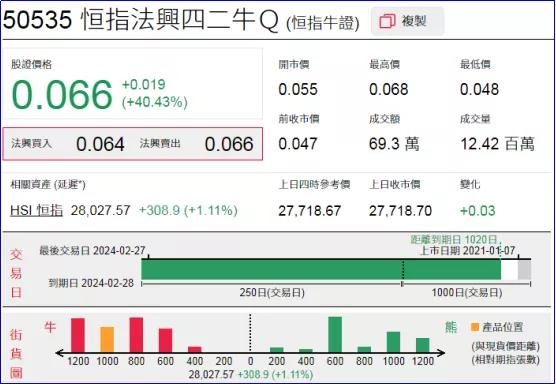 1、强势轮证:恒指法兴四二牛(50535.HK),上周五大涨40.43%;
