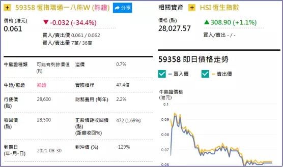 2、看错方向:恒指瑞通一八熊(59358.HK),上周五大跌34.41%。