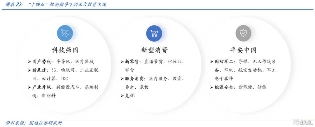 在“十四五”以国内大循环为主、国内国际双循环新发展格局指导下,结合政策力度、行业前景、增长空间等,我们梳理出三大投资主线。