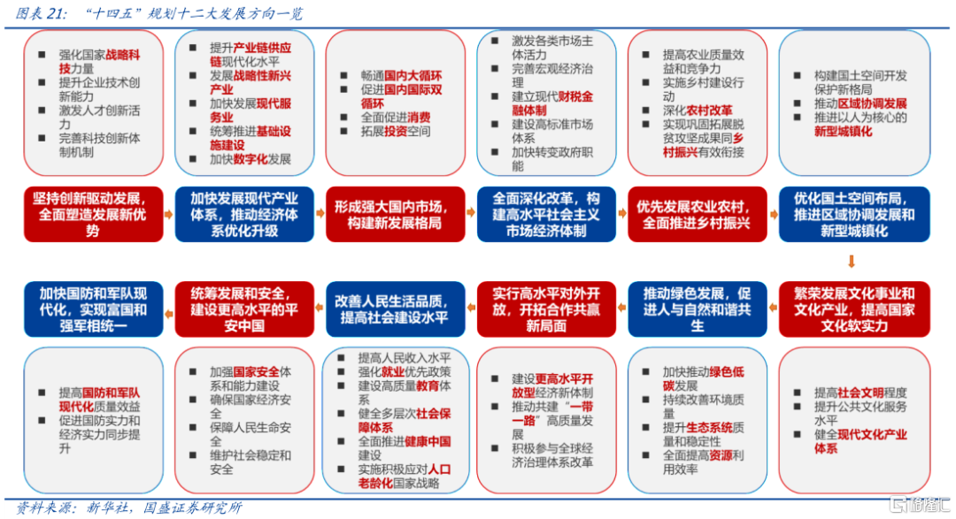 根据新的目标和新的战略,“十四五”确立十二大战区布局,明确了科技创新、产业发展、国内市场、深化改革、乡村振兴、区域发展、文化建设、绿色发展、对外开放、社会建设、安全发展、国防建设等重点领域的思路和重点工作。