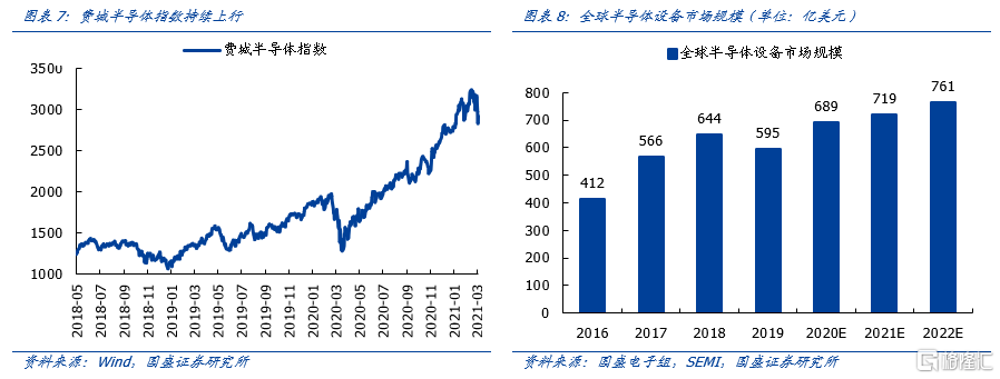 另一方面,半导体设备投资同比增速在2019H2拐点已经出现,持续上行;北美半导体设备出货持续强劲,根据 SEMI 数据,2021年1月北美半导体设备制造商出货额达到30.4亿美元,同比增长29.9%,环比增长13.4%。SMEI 预计,2020年全球半导体设备销售为689亿美元,同比增长16%,预计2021/2022年全球半导体设备销售为719/761亿美元,将连续三年创新高。