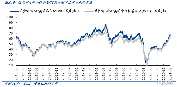 近期国际油价大涨,创下近期新高。近期OPEC 会议主要产油国宣布维持减产政策带动油价大幅上涨,布伦特油价和WTI油价分别涨至67美元/桶和63美元/桶,创下2020 年疫情以来油价新高,基本回到2019年的水平。