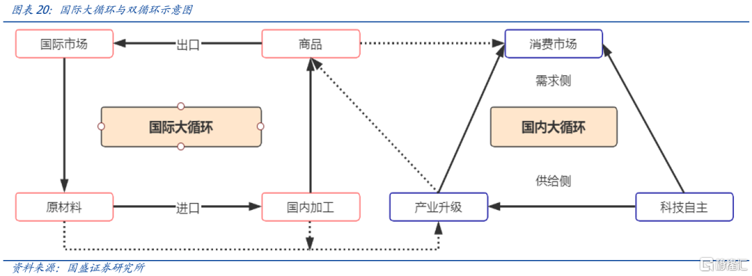 产业升级是双循环的加速器,“十四五”规划对实体经济和制造业的重视程度再度提升。“十四五”规划强调“坚持把发展经济着力点放在实体经济上”、“推进产业基础高级化、产业链现代化”、“保持制造业比重基本稳定”。我国产业链大而不强、部分环节薄弱或缺失,难以形成高质量内循环闭环。只有加快发展现代产业体系、推动经济体系优化升级,才能既保障国内产业链供应链安全,以更好地对抗外来的战略遏制,又提升国际产业链对我国的依存程度、加速产业升级双循环,以建立制造强国、质量强国。