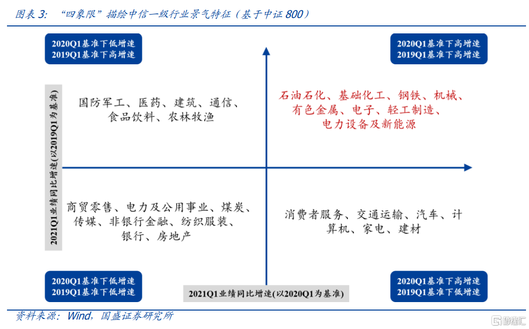我们从中信一级行业龙头(基于中证800)的视角,以2019Q1和2020Q1为基准分别求得2021Q1的各行业业绩增速。然后沿用2021Q1业绩预告分析中采用的“四象限”描绘行业景气特征的方式,我们按照是否高于行业中位数水平来划分“增速高”和“增速低”,并依据两种增速的不同分类将行业划分为四组,即“增速双高”、“增速双低”、“2019Q1为基准的增速高&2020Q1为基准的增速低”和“2019Q1为基准的增速低&2020Q1为基准的增速高”,并据此分析不同行业在本次疫情冲击之后的行业景气特征。