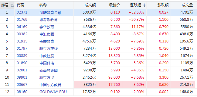 今日教育股集体大爆发,创联教育金融涨超30%,思考乐教育涨20%,宇华教育涨11%,中教控股涨5%,新高教集团涨4%,新东方涨近4%,新东方在线涨近6%。