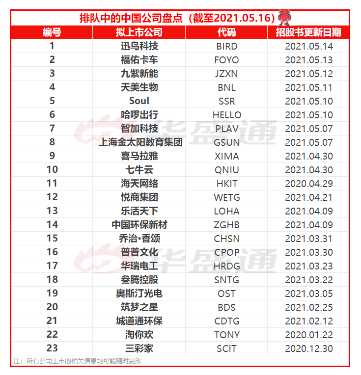 除了以上预计本周登场的3只新股外,还有一批正在SEC排队的中国公司值得关注,具体信息都已经在下表整理好了。其中,福佑卡车和Soul为新增递表的两家公司;智加科技拟将通过SPAC方式上市。