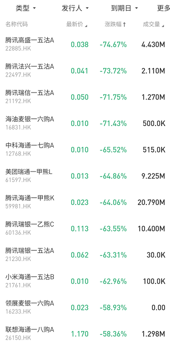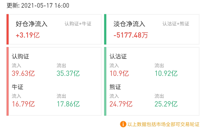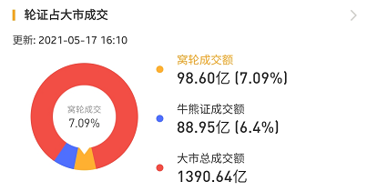 其中,窝轮总成交98.6亿港元,牛熊证总成交88.95亿港元。