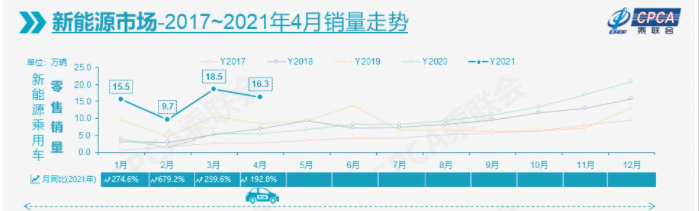 根据中国乘联会数据统计,中国4月新能源狭义乘用车销量达16.3万台,同比大幅增加192.8%。1-4月累计销量已达到60万辆,同比增长265.6%。