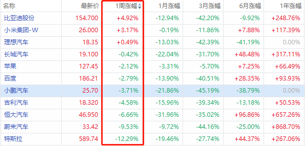 受此一系列偏负面的消息影响,特斯拉股价在上周表现低迷,周跌幅超12%,在新能源车板块里垫底。
